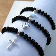 This lovely crystal stretch bracelet is made from 8mm black crystals on stretch elastic. Make your bracelet the perfect choice for the person receiving it with your choice of charm. The perfect gift for a woman or girl for birthday, Christmas, anniversary, Christening or as a Thank You. Great for a Christening, Holy Communion, Girls 18th or 21st Birthday, a Thank You Gift or for Good Luck!