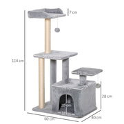 PawHut Cat Tree Tower for Indoor Cats 114cm Climbing Activity Centre Kitten with Sisal Scratching Post Perch Hanging Ball Condo Toy Light Grey