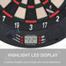SCORING BOARD: Easy to read control panel with LCD display scoring and statistics. Language tips with volume control with returning darts and eliminating points, automatic scoring (it can play against computer players)
