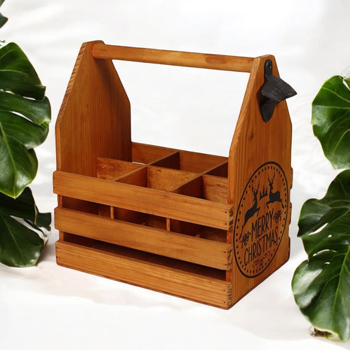 WOODEN 6 BOTTLE HOLDER WITH METAL OPENER