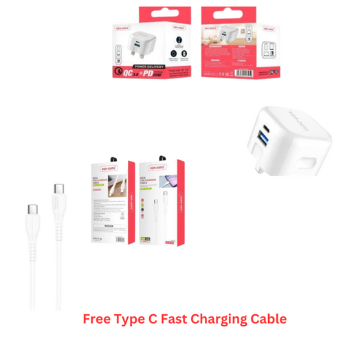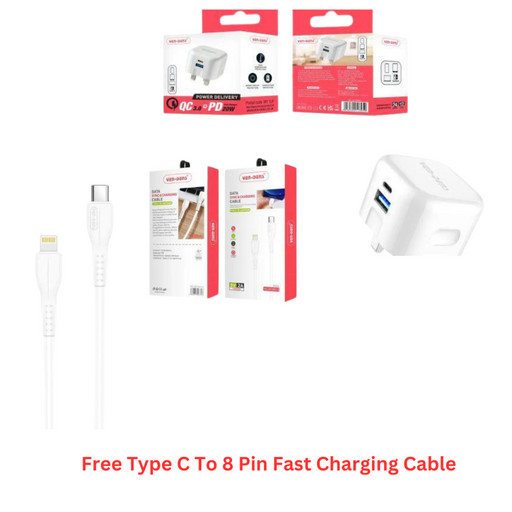 View full detailsVen-Dens Dual Port 20w Fast Charger With Fast Charging Type C to 8pin Cable Free