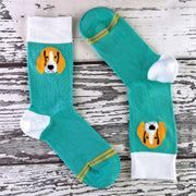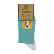 The Talkie socks with dogs on and cats logo is printed on the foot of the sock. These soft cotton crew socks have knitted designs of your favorite types of dog. Pick between a scotty dog, cute pug and a quirky beagle to show your love for your best friend. Or, choose our cat style if you are more of a cat person. They all have their specific pastel colour, so if you are in the mood for bright feet then these would be purrfect. As a gift, these socks with dogs on and cats are a brilliant secret santa or stocking filler idea. These socks are also ideal to wear to the office and guaranteed to put a small or cheeky laugh on anyone's face!