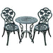 This bistro set will be a great addition to any patio area with its elegantly antique design. It is made from sturdy rust free cast aluminum and molded into an antique green look. The legs of the table and two chairs are made of sturdy iron, which provides a stable place to rest. Whether in your backyard, patio, deck or even your restaurant outdoor dining space, you'll enjoy these chairs for years to come.