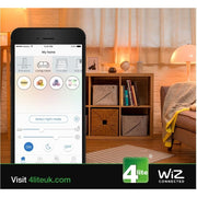 The 4lite WiZ Connected A60 Dimmable Multicolour WiFi LED Smart Bulb provides 16 million colours and tuneable white dimmable light. The LED's 8W is equivalent in brightness to 60W. It can be controlled via the WiZ App and by voice controlled smart devices - Google, Alexa, Siri, Samsung Smart Things