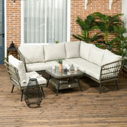 5 PCS Rattan Corner Sofa, Rattan Garden Furniture w/ Glass Top Two-tier Table