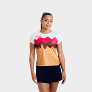 Show off your sweet side with this vanilla soft scoop, raspberry, and chocolate sauce design, paired with a golden brown waffle cone pattern. Perfect for catching the eye of opponents with a sweet tooth! This top combines its delightful design with cutting-edge technology, featuring lightweight, moisture-wicking, and breathable fabric for exceptional performance. Crafted to withstand the challenges of any racket sport, from tennis and badminton to padel, pickleball, and squash, this AIXO shirt is your ultimate choice.