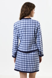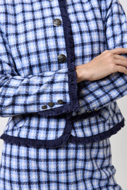 Effortlessly elevate your style with the Amora spring tweed fringe trim jacket. Crafted in a wool rich blue check, this "Chanel" style jacket exudes sophistication. Pair it with the Aubin matching skirt for the office or an event. Keep it casual with favourite denim for a chic Parisian vibe.