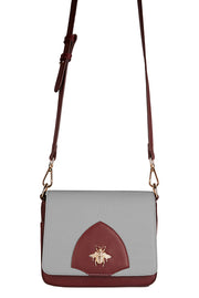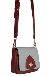 Keep your essentials organized with our Baye grey & burgundy crossbody bag. This versatile bag features 3 internal pockets for ultimate functionality. Crafted with a mix of durable fabrics, the front flap features an elegant brass bee motif.