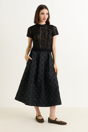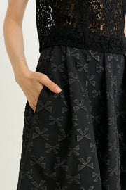 The Belita Bow jacquard midi skirt is designed to transition effortlessly from day to evening. Crafted from a distinctive bow jacquard fabric, its longer-than-average midi cut provides a flattering silhouette that anchors your wardrobe. Pair it with the Rufaro lace blouse or the Ives bow cardigan for polished, versatile styling options perfect for special occasions or elevated everyday looks.
