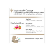 The fragrance opens with vibrant notes of citrus, green leaves, and a hint of pepper, delivering a crisp and refreshing introduction. The heart reveals aromatic lavender, geranium, and subtle spices, adding depth, elegance, and a refined masculine character. The base notes of amber, cedarwood, and musk provide warmth, smoothness, and a long-lasting woody finish that anchors the fragrance beautifully.