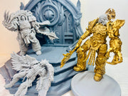 This dramatic Warhammer 40K diorama captures the climactic moment of the Siege of Terra: the Emperor of Mankind confronting his fallen son, Warmaster Horus, aboard the Vengeful Spirit.