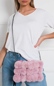 RYLAN Cross Body Pom Pom Handbag - Cute Pink Bag with Long Strap, Silver Hardware, and Zip Closure