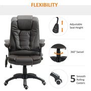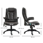 Luxurious Executive Office Chair w/ Massage and Heat, Brown" Description: - Indulge in ultimate comfort and style with our Executive Office Chair with Massage and Heat in a rich brown colour. This chair is designed to take your office experience to the next level. - Experience the ultimate relaxation with our heating and vibrating massage feature. With six massage points and five different settings, you can target your upper back, lower back, and legs for personalized comfort. The chair also offers independent heating and vibrating options to suit your preferences. - Not only is this chair comfortable, but it also adds a touch of elegance to your workspace. The thick padding, tall back, and armrests provide exceptional support, making it the perfect place to spend long hours at your desk. - Our executive office chair is upholstered in high-quality faux leather for a luxurious and sophisticated look. It not only feels great but also enhances the aesthetic appeal of any professional setting. - Easy mobility is another key feature of this chair. With five wheels, you can effortlessly move from one area of your office to another. The swivel feature allows for convenient side-to-side movement, ensuring maximum flexibility and productivity. - With dimensions of 111-121H x 68W x 74Dcm, and a reclined position measuring 106-116H x 68W x 104Dcm, this chair fits perfectly in any office space. Its sturdy construction allows for a maximum load capacity of 120kg, providing assurance of durability and longevity. - Please note that assembly is required, but our comprehensive instructions make it quick and easy to put together. Key Attributes: - High-quality faux leather upholstery - Six massage points with five settings - Independent heating and vibrating options - Thick padding, tall back, and armrests for extra comfort - Easy mobility with five wheels and swivel feature - Suitable for various office spaces - dimensions provided - Maximum load capacity of 120kg - Assembly required