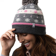 This pom pom hat has a turn over cuff and a large faux fur fluffy pom pom on the top of the hat. This hat has a stylish and funky outer to give a fashionable touch. They come in 2 styles which consist of chucky stripes & a winter fairisle pattern and those styles have 2 colours available: Black/Grey & Grey/Pink.