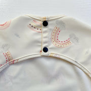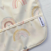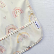 Beautiful pink rainbows on a cream background make up our rainbow print baby bib. Bobbin and Bumble rainbow caped baby bibs are waterproof and wipeable so they will keep babies clean during meal times, crafting and messy play. Generous sizing means that they can fit from 6m up to 36m.