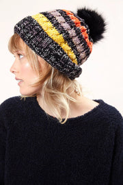 Louche Orla Striped Knitted Beanie With Faux Fur Bobble - Black