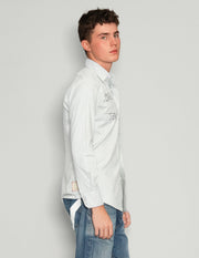 Classic mens white collared shirt, 100% cotton. Customised with "Love Will Tear Us Apart" embroidery.