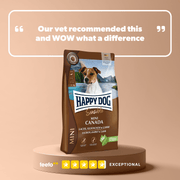 Happy Dog Mini Canada is a grain and gluten-free recipe made with salmon, rabbit, and lamb, perfect for small, sensitive, or active dogs. With added herbs, flax seeds, and New Zealand mussels, it supports digestion, joints, and overall wellbeing in dogs up to 10 kg.