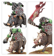 Some Orcs have adopted ill-tempered boars as their mounts. Once up to speed, boars can be almost unstoppable, their powerfully churning legs propelling them into the enemy where their goring tusks and stamping hooves can do untold damage. From atop their precarious perch, an Orc can set about the foe with spear and choppa, knowing that should they fall, their mount will give them a proper good kicking.