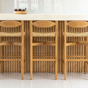The Raka Rattan Bar Stool begins with a solid teak frame, cut, shaped, and assembled by hand to create a stable and balanced structure. The design incorporates a defined back rail that offers subtle support while keeping the overall form clean and restrained. Once the frame is complete, the seat is finished with a woven rattan blend, applied carefully to achieve even tension and long-term durability.