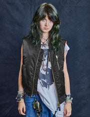 Repurposed, vintage US Air Force women's black bomber gilet. 100% Nylon, with outer-breast zip pocket and zip front, featuring a custom screen print of our favourite Rock n Roll icon mugshot on the back. Reversible design, featuring bright orange lining, originally intended for visibility in emergencies with two extra flap pockets inside.