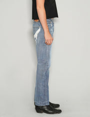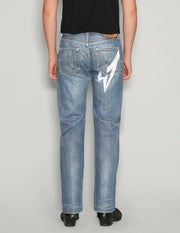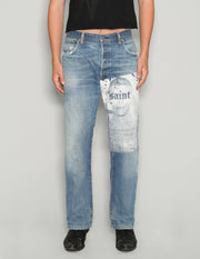 Unisex, 'Saint' Vintage Levi’s 501 jeans. Each pair is super rare and printed in our East London tailoring shop, featuring a custom screen print of our favourite Rock n Roll icon mugshot. All come with the finest detailing with ST logo and labelling, signed and dated with your name by Stuart, himself. Grab these special jeans, while stock lasts!