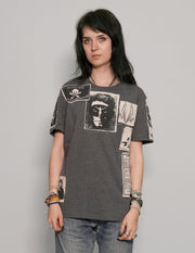 Women's grey t-shirt crafted from 50% GOTS certified organic cotton and 50% recycled organic cotton from factory, cutting waste. Relaxed fit, featuring custom screen printed denim patches with one of our favourite Rock n Roll icon.