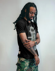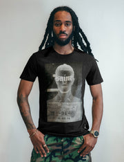 Mens black t-shirt crafted from soft, GOTS certified, 100% organic cotton with relaxed fit, featuring a custom screen pring of our favourite Rock n Roll icon mugshot with "Saint" lettering over top, paying homage to a true music legend.