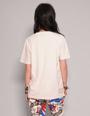 Women's ecru t-shirt crafted from 50% GOTS certified organic cotton and 50% recycled organic cotton from factory, cutting waste. Relaxed fit, featuring the famous quote by Steve Jones from the Sex Pistols. Before the band had even released a single, Jones told the press, “We’re not into music, we’re into chaos.” From “Anarchy In the UK” onwards the Sex Pistols’ noncompliant behaviour sent shockwaves through the music industry.